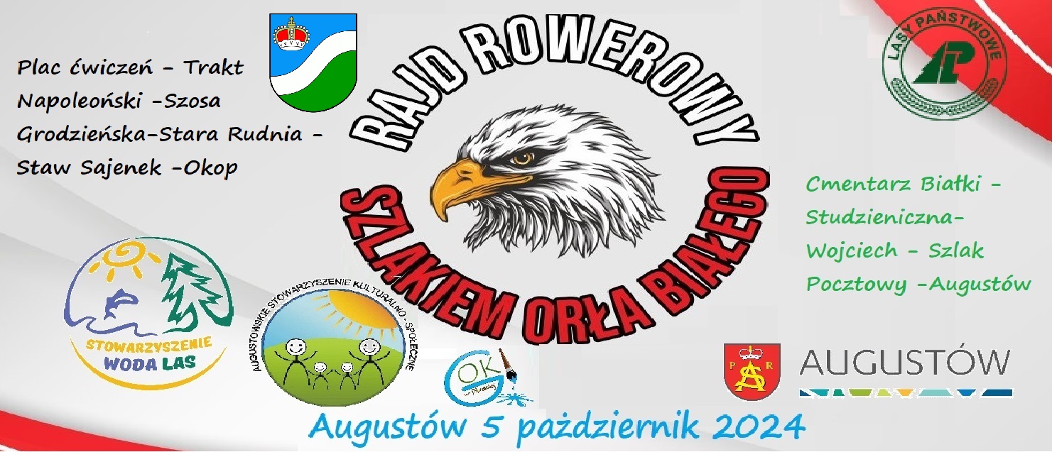 W dniu 5 października (sobota) Stowarzyszenie Woda Las wraz z Lasami Państwowymi i Augustowskim Stowarzyszeniem Augustowskie Stowarzyszenie Kulturalno - Społeczne organizuje historyczno-poznawczy rajd rowerowy szlakiem Orła Białego. Miało to być z okazji pożegnania lata ale ktoś już nas uprzedził z tą nazwą to będzie z okazji powitania jesieni. Rajd zaczyna się i kończy na początku Szlaku Orła Białego przy ul. Turystycznej w Augustowie o godz. 10.00. Trasa liczy około 17 km. Na koniec przewidziane jest ognisko , skromny partyzancki posiłek i jakieś pamiątkowe upominki. Cena symboliczna 20 pln od osoby pełnoletniej. Dzieci i młodzież za darmo.