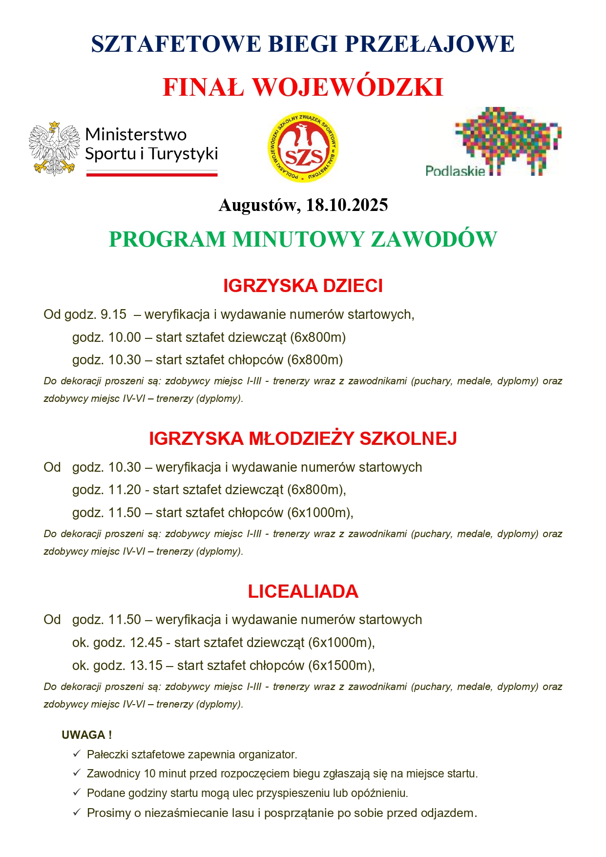 Informujemy, że Finał Wojewódzki w sztafetowych biegach przełajowych 18.10.2025 odbędzie się nie jak planowano w Przewięzi ale w Augustowie „na Borkach”. Parking dla autokarów w pobliżu kościoła przy skrzyżowaniu ulic Nowomiejskiej i Alei Jana Pawła II.