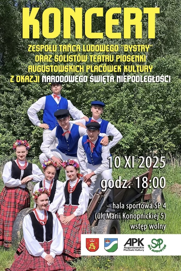 Serdecznie zapraszamy na koncert z okazji Narodowego Świeta Niepodległości, w którym wystąpią wszystkie grupy Zespołu Tańca Ludowego „Bystry” oraz soliści Teatru Piosenki Augustowskich Placówek Kultury.