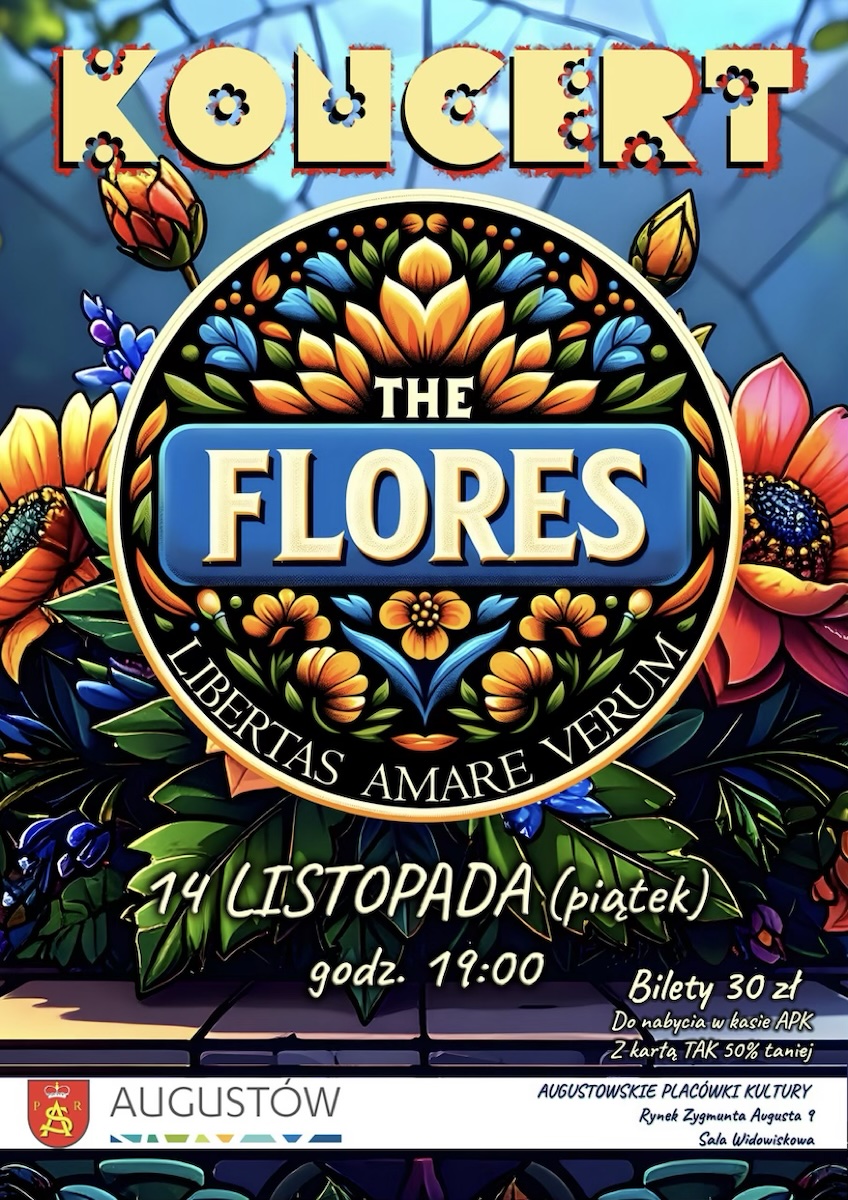Augustowskie Placówki Kultury serdecznie zapraszają w piątek 14 listopada 2025 roku o godz. 19:00 do Sali widowiskowej MDK (Rynek Zygmunta Augusta 9, wejście od ul. Kościelnej II piętro) na koncert augustowskiego zespołu The Flores!